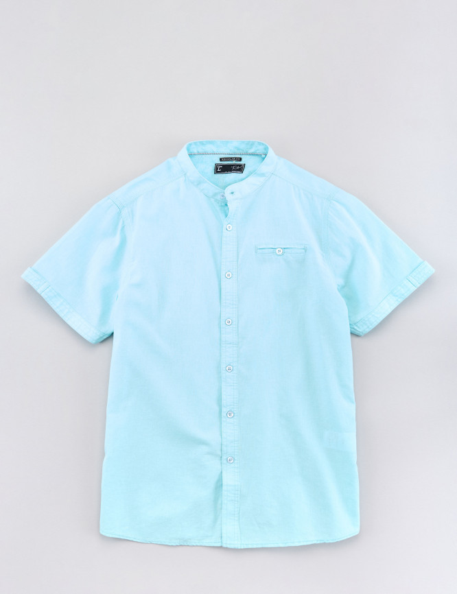 • Colletto alla coreana, abbottonatura su tutta la lunghezza e stretta tasca pasquale con bottone