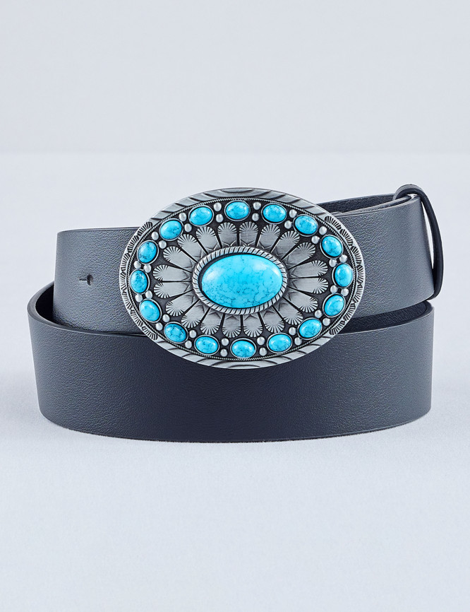 • Türkise Schmucksteine machen den Gürtel zum echten Hingucker