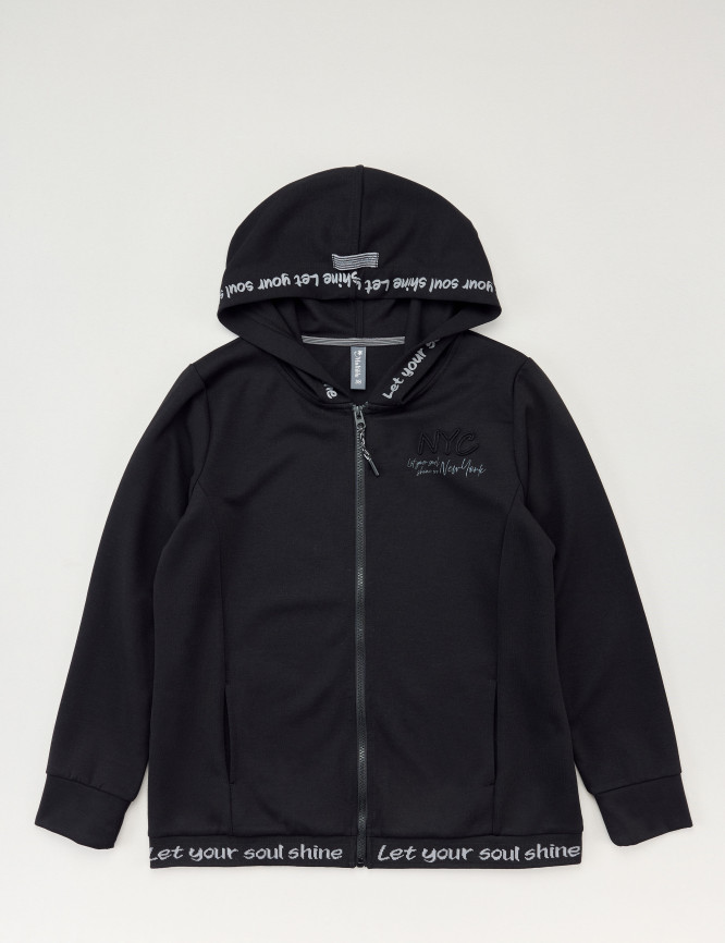 • Vorne mit durchgehendem Zip, formgebenden Teilungsnähten, einem kleinen Glitzerprint und seitlichen Eingrifftaschen