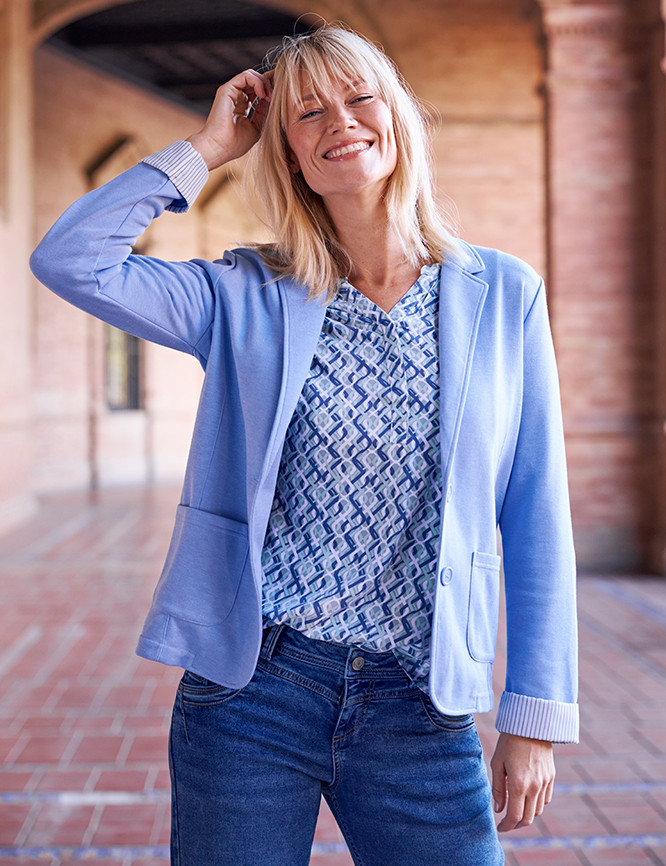 • La fodera a contrasto a righe chiare sui polsini rende il look sportivo ma chic