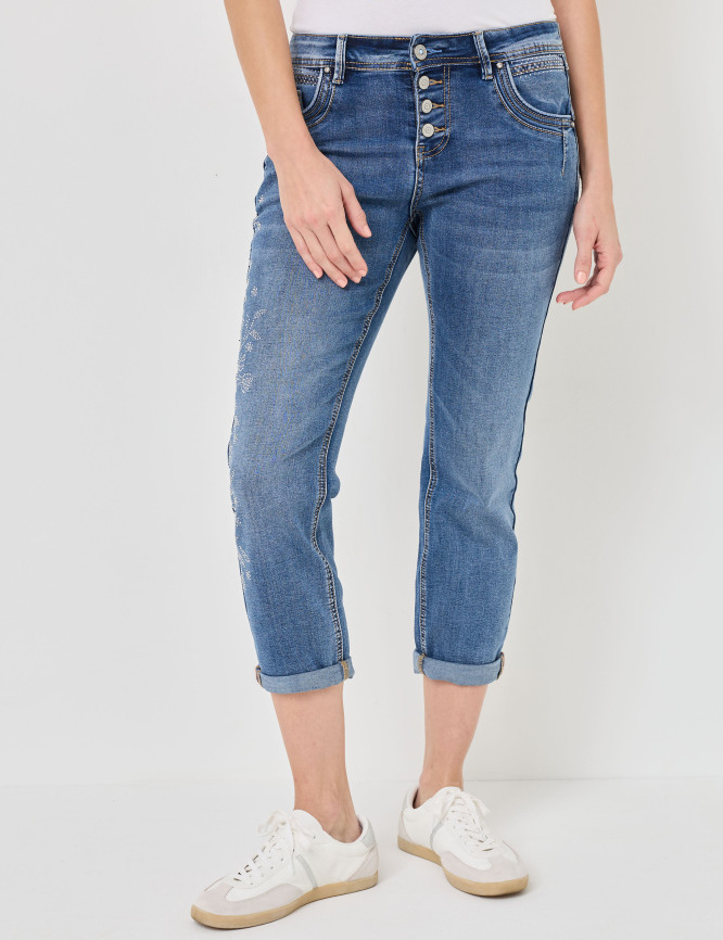 • Tasche laterali e posteriori con cuciture decorative e rivetti
